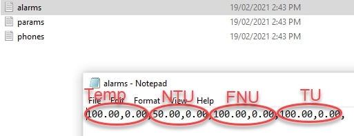 alarms: the alarms file is responsible for setting the limits for the turbid sensor to report to the user via SMS if the values are outside of the desired operating ranges. It is in the format of max,min, etc.. separated with commas and no spaces in between them. For each sensor reading the max and min valuesliits are in order of Temperature (in °C), Nephelo in NTU and FNU units respectively and lastly TU in mg/L unit. Also it is important to have the last comma present at End Of File.