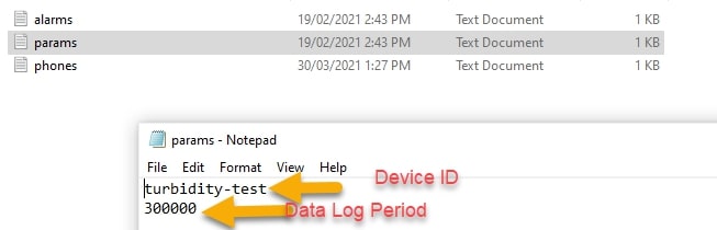 params: the params file is responsible for identifying the device over SMS followed by the value indicating the time period between data logged to SD card, the examples show the “turbidity-test” as device id and “300000” is the millisecond value of 300 seconds which is 5 mins recording period.