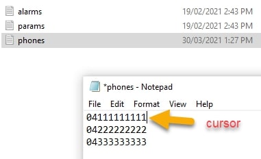 phones: this file is responsible for adding in the phone numbers that will be assigned to the request and reporting of turbid values over SMS. The examples shows 3 numbers added to the list and this ensures that no outside number can communicate with the sensors. The cursor is emphasised in the image below to indicate that no trailing spaces must be present for the numbers to work on the texting system. Also, the cursor must be present on the line below the last number to indicate the End of File is not present in the last digit of the last number but below the number for it to work. This shows how sensitive the files are to errors. If all parameters are done correctly, the desired numbers after switching on the modules will receive a status update on the devices to indicate they are running and able to communicate via SMS.