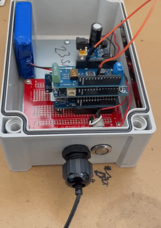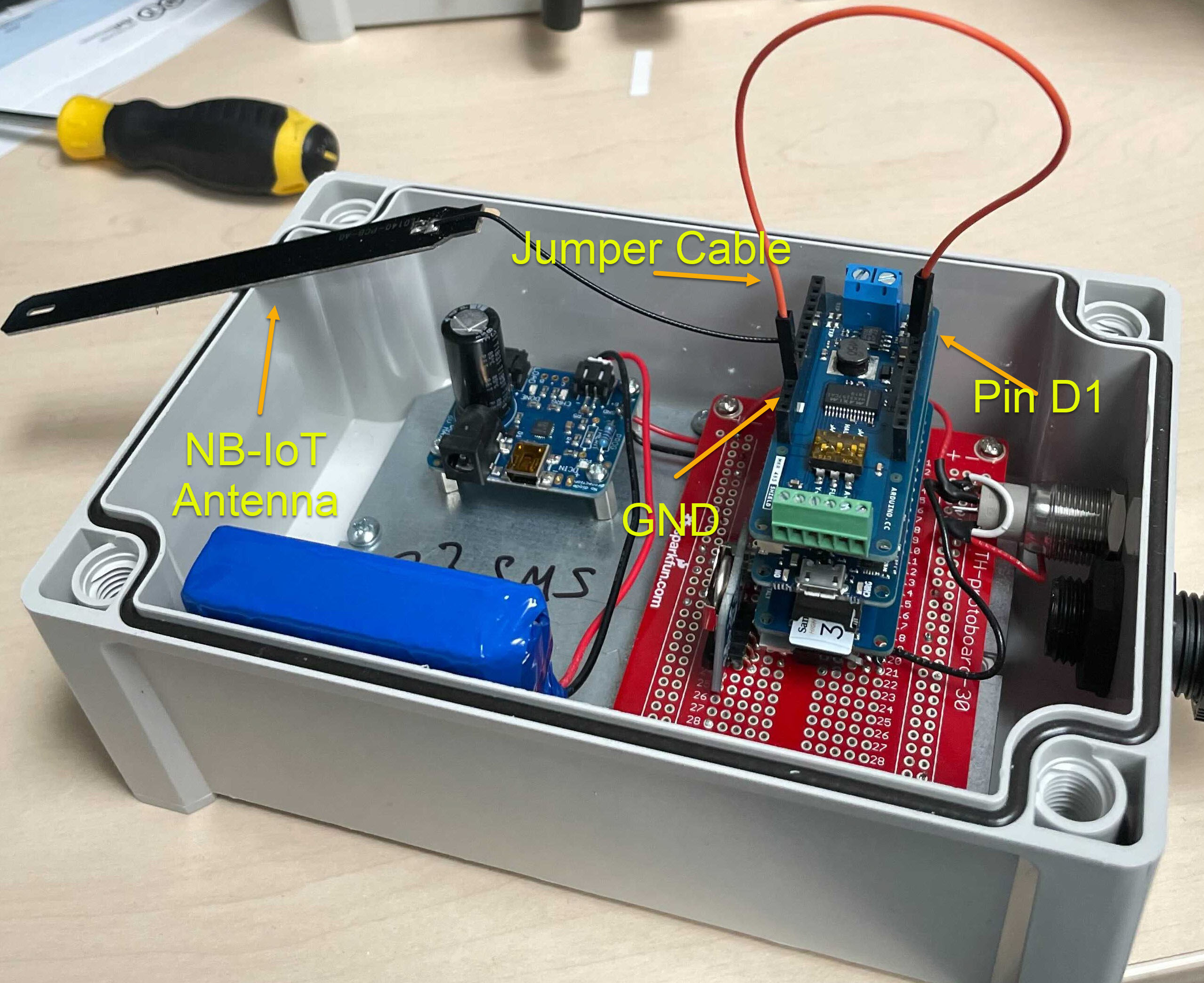 - As mentioned above, the most clear distinction for identifying the sms module is the presence of a jumper wire and an NB-IoT antenna. Also, when starting up the module via the LED button switch, the LED indicator on the button and Arduino MKR 1500 will flash for a moment and then only flash every specified time frame as per the above data logging indication.